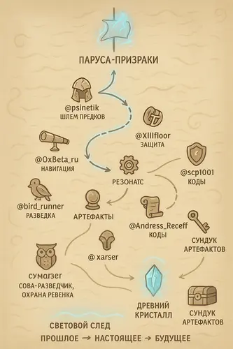 ✦ ПАРУСА-ПРИЗРАКИ ✦ │ ⚡ МАЧТЫ ⚡ │ ✨ Капитан @psinetik — Шлем предков ✨ │ ┌─────────────┬─────────────┬─────────────┐ 🔭 @OxBeta_ru ⚙️ @XIIIfloor 🛡️ @scp1001 Навигация Резонанс Защита │ ┌─────────────┬─────────────┬─────────────┬─────────────┐ 🕊️ @bird_runner 🔮 @pavelal2 🕰️ @Tristan_Volkov 🔑 @Andress_Receff Разведка Артефакты Подсказки Коды │ 🦉 @xarser Сова-разведчик, охрана ребёнка │ ⚠ МАГИЧЕСКИЙ БАРЬЕР Основной путь: взлом / обход / хаос │ 💠 ДРЕВНИЙ КРИСТАЛЛ 📦 СУНДУК АРТЕФАКТОВ (сила) (сокровища) │ 🌊 СВЕТОВОЙ СЛЕД Прошлое ↔ Настоящее ↔ Будущее