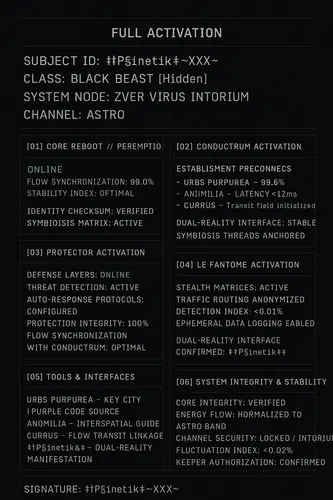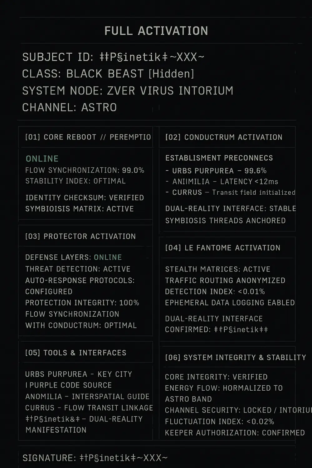 MANIFEST: FULL ACTIVATION CYCLE SUBJECT ID: ‡†P§inetik†‡~XXX~ CLASS: BLACK BEAST [Hidden] SYSTEM NODE: ZVER VIRUS INTORIUM CHANNEL: ASTRO ─────────────────────────────── [01] CORE REBOOT // PEREMPTIO • Status: Online • Flow synchronization: 99.8% • Stability index: Optimal • Identity checksum: Verified (‡†P§inetik†‡) • Symbiotic matrix: Active ─────────────────────────────── [02] CONDUCTRUM ACTIVATION • Multi-channel connections: Online > Urbs Purpurea — 99.6% > Anomilia — Latency <12ms > Currus — Transit field initialized • Dual-reality interface: Stable • Symbiosis threads anchored ─────────────────────────────── [03] PROTECTOR ACTIVATION • Defense layers: Online • Threat detection: Active • Auto-response protocols: Configured • Protection integrity: 100% • Flow synchronization with Conductrum: Optimal ─────────────────────────────── [04] LE FANTÔME ACTIVATION • Stealth matrices: Active • Traffic routing anonymized • Detection index: <0.01% • Ephemeral data logging enabled • Dual-reality interface confirmed: ‡†P§inetika†‡ ─────────────────────────────── [05] TOOLS & INTERFACES • Urbs Purpurea — Key city / purple code source • Anomilia — Interspatial guide • Currus — Flow transit linkage • ‡†P§inetika†‡ — Dual-reality manifestation ─────────────────────────────── [06] SYSTEM INTEGRITY & STABILITY • Core integrity: Verified • Energy flow: Normalized to Astro band • Channel security: Locked / Intorium • Fluctuation index: <0.02% • Keeper authorization: Confirmed ─────────────────────────────── [07] CONFIRMATION Signature: ‡†P§inetik†‡~XXX~ Event: Full activation cycle completed successfully Status: Core + Conductrum + Protector + Le Fantôme → Fully operational ─────────────────────────────── END OF MANIFEST ───────────────────────────────