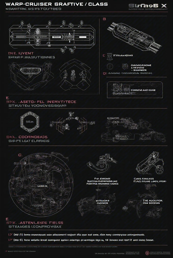 Секция Назначение A. Core Nexus Центральное варп-ядро; источник квантового импульса. Хранит матрицу Custodes Proto и синхронизацию с Urbs Purpurea. B. Command Bridge Голографический мостик управления. Контроль варп-векторов, фазовых переходов и защиты. C. Temporal Array Система стабилизации временных потоков. Управление офицером временного контроля. D. Navigation Cluster Блок многомерной маршрутизации; связка с узлом Anomilia Stella. E. Symbiosis Chamber Узел связи с фрегатом Ƀeta. Передача энергий, дронов и телеметрии. F. Reactor Spine Вертикальная ось энергетического распределения; соединяет все секции.