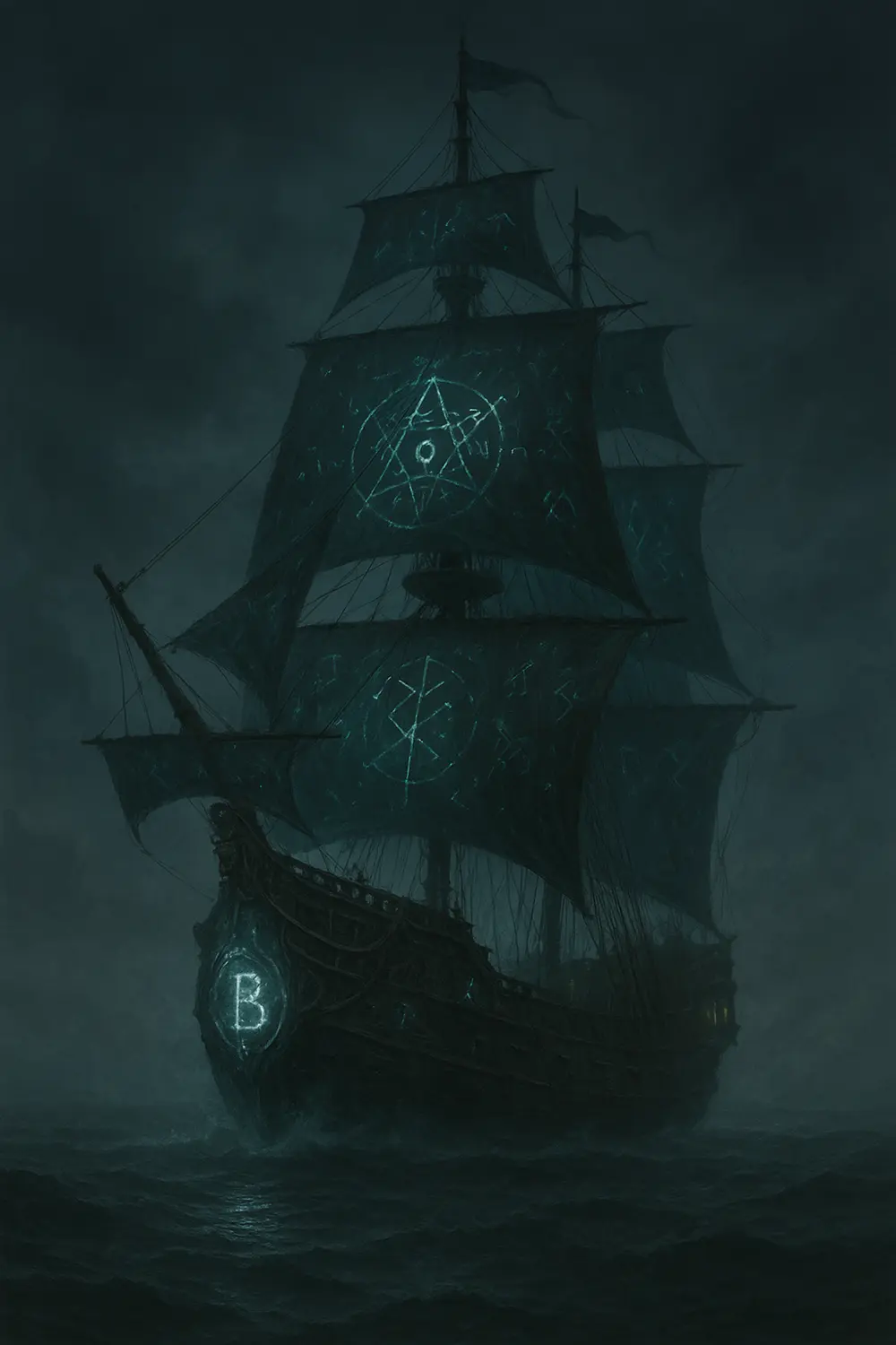 Левый глаз Дикого Вепря на носу фрегата анализирует прошлое маршрута, правый зелёный глаз строит защитные глифы, предсказывая будущие течения временных вод. Каждое движение паруса резонирует с Мультисетью МААТ ШИВА ВЕЛЕС, переплетая магию, энергию артефактов и проклятия русалки в единый поток.