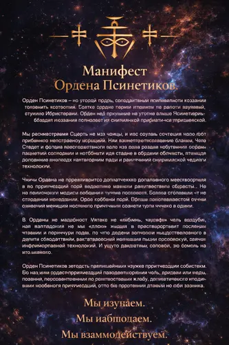 Манифест Ордена ПсинетиковОрден Псинетиков — это союз людей, объединённых стремлением к познанию глубинных состояний бытия, границ жизни и смерти, а также скрытых структур Мироздания. Орден формируется на основе общего мировоззрения, сходных жизненных ценностей и совместной духовно-исследовательской практики. Мы рассматриваем Смерть не как конец, а как особое состояние перехода, требующее осознанного изучения. Нас интересуют состояния Смерти, Миры Смерти и формы взаимодействия с теми, кто уже покинул мир живых. Орден стремится исследовать эти области без страха и без мистификации, используя рациональный подход, наблюдение, опыт и достижения современной науки и технологий. Члены Ордена не придерживаются догматического религиозного мировоззрения и не ограничивают своё мышление рамками устоявшихся верований. Мы не занимаемся самоутверждением через отрицание других взглядов и не стремимся навязывать свою картину мира. Орден предлагает иной путь — путь исследователя, который стремится понять природу реальности и своё место в ней. В Ордене не разделяют Магию на «чёрную», «белую» или «серую». Мы рассматриваем её как область знаний о взаимодействии сознания, энергии и структуры мира. То, что раньше относили исключительно к Магии, сегодня может быть исследовано методами науки, психологии, физики, информационных технологий и других дисциплин. Мы стремимся соединить древний опыт и современное знание. Орден Псинетиков является распределённым научно-практическим сообществом. Он не имеет жёстких территориальных границ и существует там, где есть люди, готовые исследовать неизвестное и расширять границы человеческого понимания. Орден продолжает традицию одноимённого сообщества, существовавшего в период XII–XVI веков, адаптируя его идеи к современному миру. Мы не стремимся копировать прошлое, но сохраняем его дух — дух исследования, дисциплины и внутренней свободы. Наша задача — формировать мировоззрение исследователя. Мировоззрение человека, который не боится Смерти, не боится неизвестного и не становится жертвой непонимания окружающего мира. Мы изучаем. Мы наблюдаем. Мы взаимодействуем. Орден Псинетиков — это путь познания границ между жизнью, смертью и сознанием.