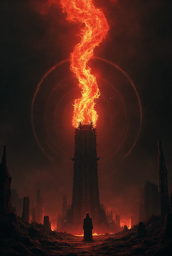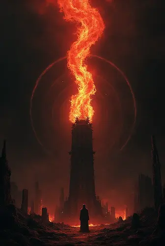 В центре возгорается костёр, раздуваемый до максимума. Пламя поднимается высоко, красное и чёрное, переплетаясь в вихри, искажая пространство. От огня расходятся кольца теневой энергии, каждое из которых ударяет в глубину Межзвёздного Маяка W.